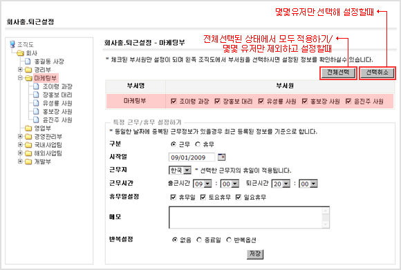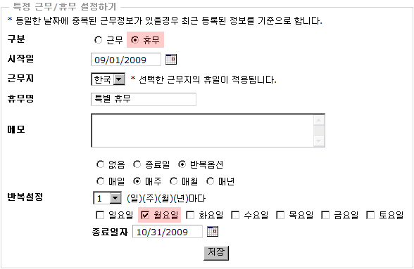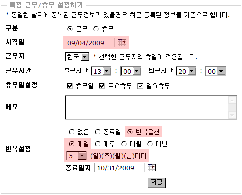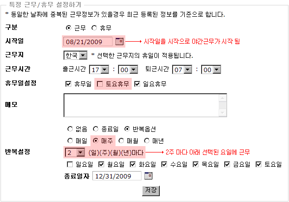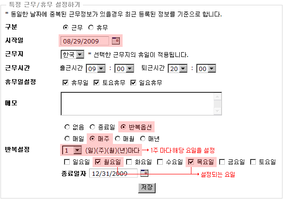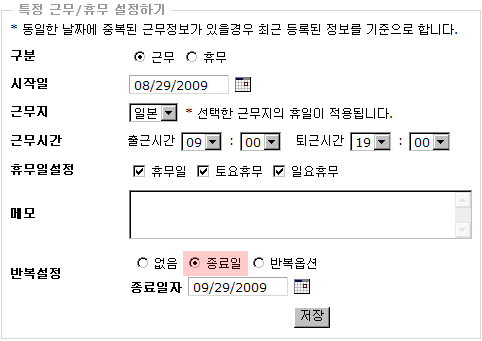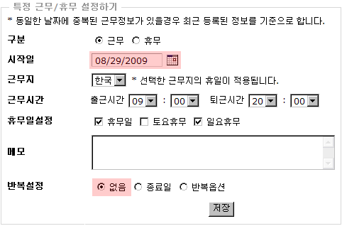 예제 ) 8월 29일 토요휴무 때 근무를 설정