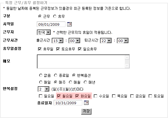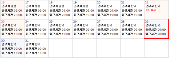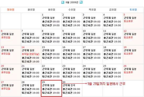 예제 ) 8월 29일 부터 9월 29일 까지 일본에서 근무 설정