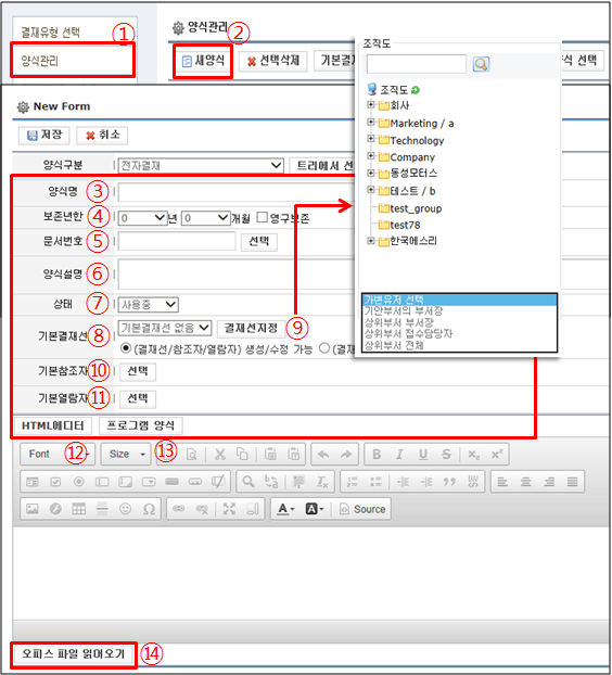 우리 회사에 맞는 결재양식을 관리자가 스스로 작성하여 사용할 수 있으며, 양식의 제목은 물론, 본문에 여러가지 복잡한 테이블 등을 관리자가 직접 작성할 수 있습니다. html 에디터로 문서 편집이 가능하고 오피스 파일을 불러와 등록할 수도 있습니다