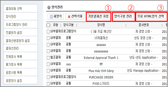 결재 양식의 사용여부를 나타냅니다. 사용안할 경우 결재작성시 양식이 보이지 않으므로 사용중으로 변경하신 후 사용 가능합니다.