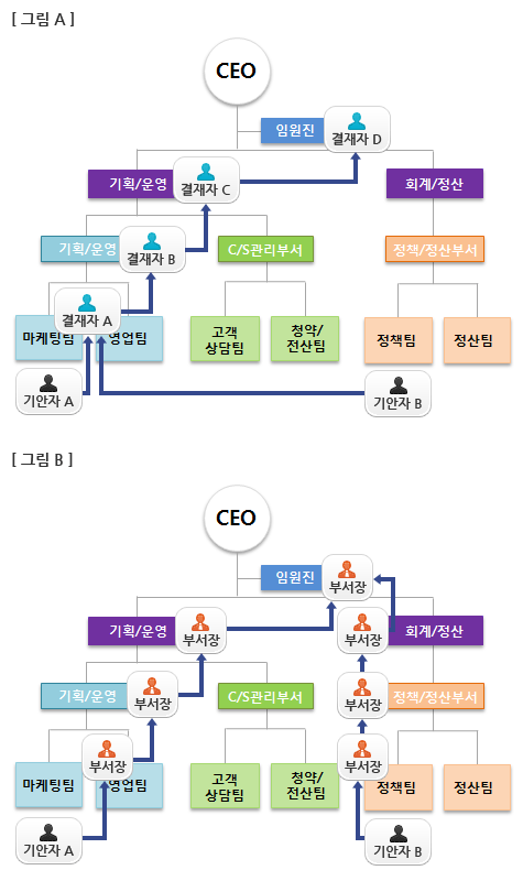 1. 결재선 팝업창의 조직도에서 부서명을 더블클릭하여 기안자가 소속된 사용자 명단이 화면하단에 표시되면, 결재선에 추가할 사용자를 선택한 후 더블 클릭합니다. 2. 결재선에 추가할 결재자가 여러 명일 경우 단계1을 반복합니다. 결재선에는 결재문서의 서명칸 수만큼 결재자를 추가할 수 있으며, 이를 초과하였을 경우 확장 표시가 나타납니다. 결재선 지정에는 고정유저(그림A)뿐만 아니라 가변유저(부서장/접수담당자)(그림B)방식을 선택하여 자동 상신하는 두 가지 방식이 있습니다.