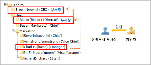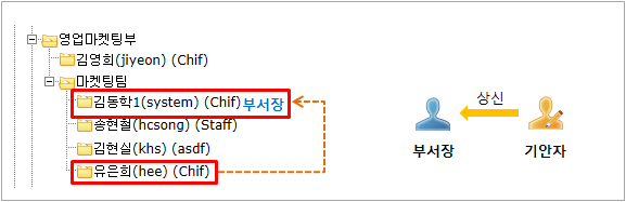 2) [상위부서 부서장] 선택 시 기안자가 속한 부서의 상위부서 부서장에게 자동 상신하는 방식입니다.