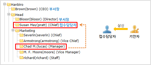 3) [상위부서 접수담당자] 선택 시 기안자가 속한 부서의 상위부서 접수담당자에게 자동 상신하는 방식입니다.
