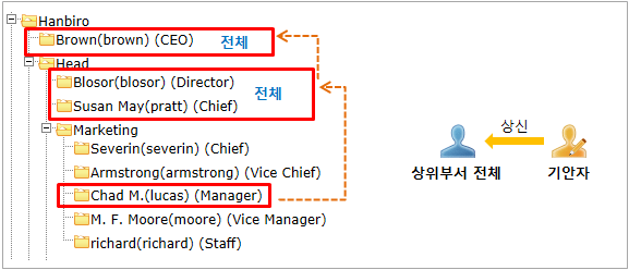 4) [상위부서 전체] 결재 구성은 Tree 방식으로 이루어지며 상위부서에 속한 모든 사용자에게 계단식으로 자동 상신하는 방식입니다. *상위부서원 전체 승인이 완료되어야만이 다음 상위부서로 상신이 가능합니다.